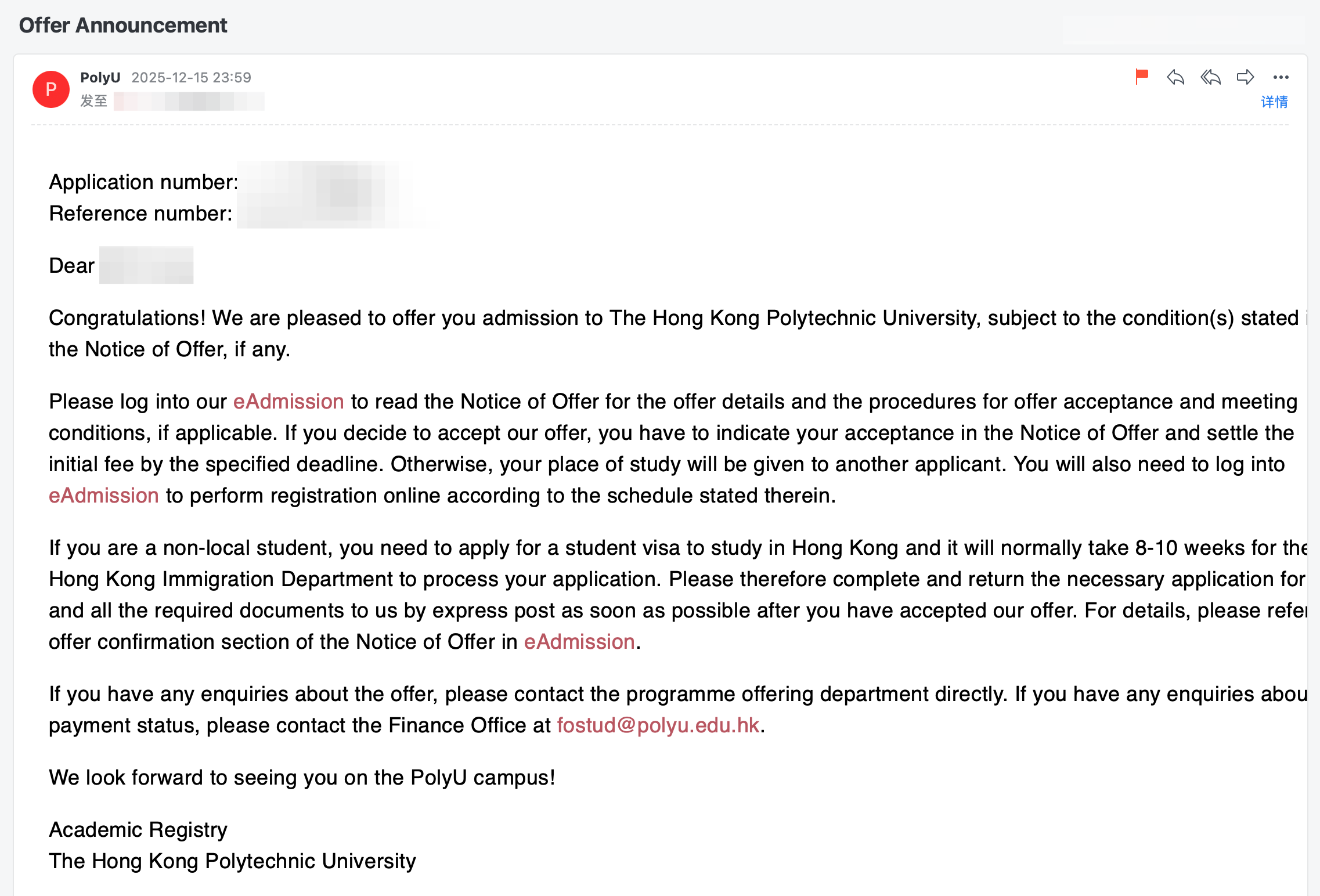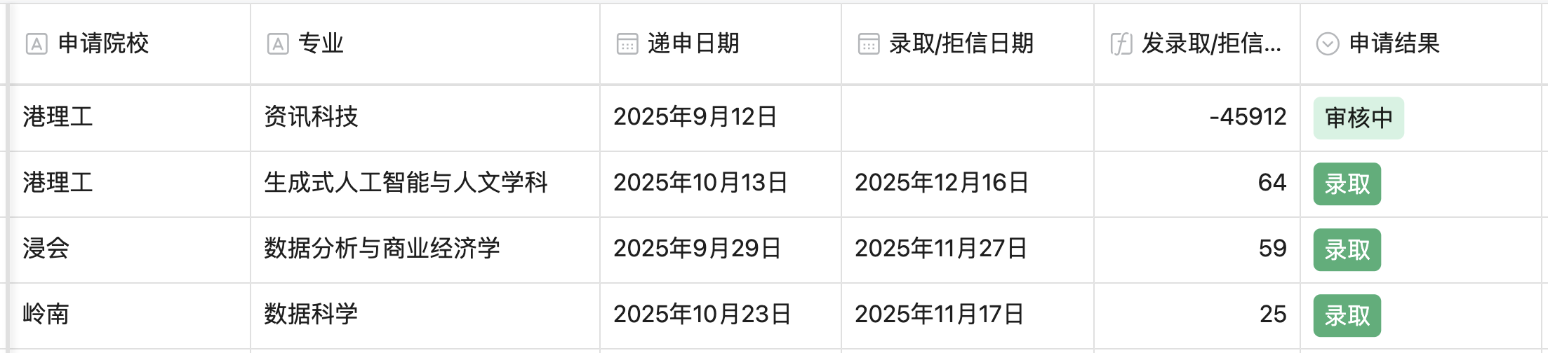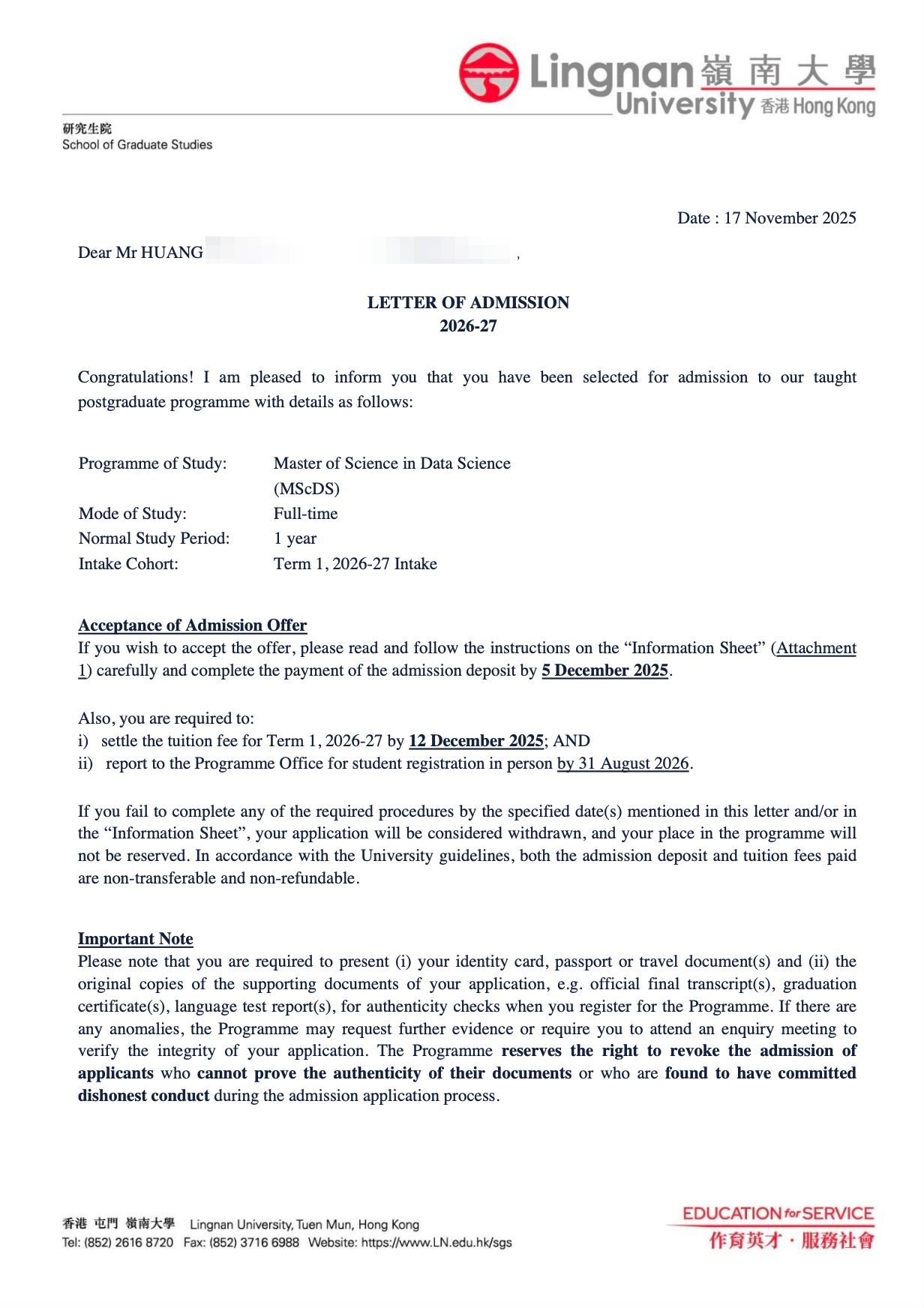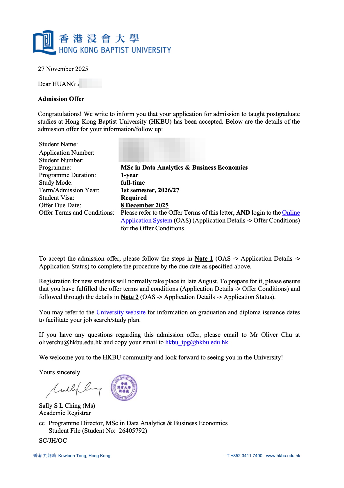 经过黄同学的努力,加上我们专业的文书和精细化面试辅导加持,目前已顺利获取港理工生成式人工智能与人文学科、浸会数据分析与商业经济学、岭大数据分析三个offer