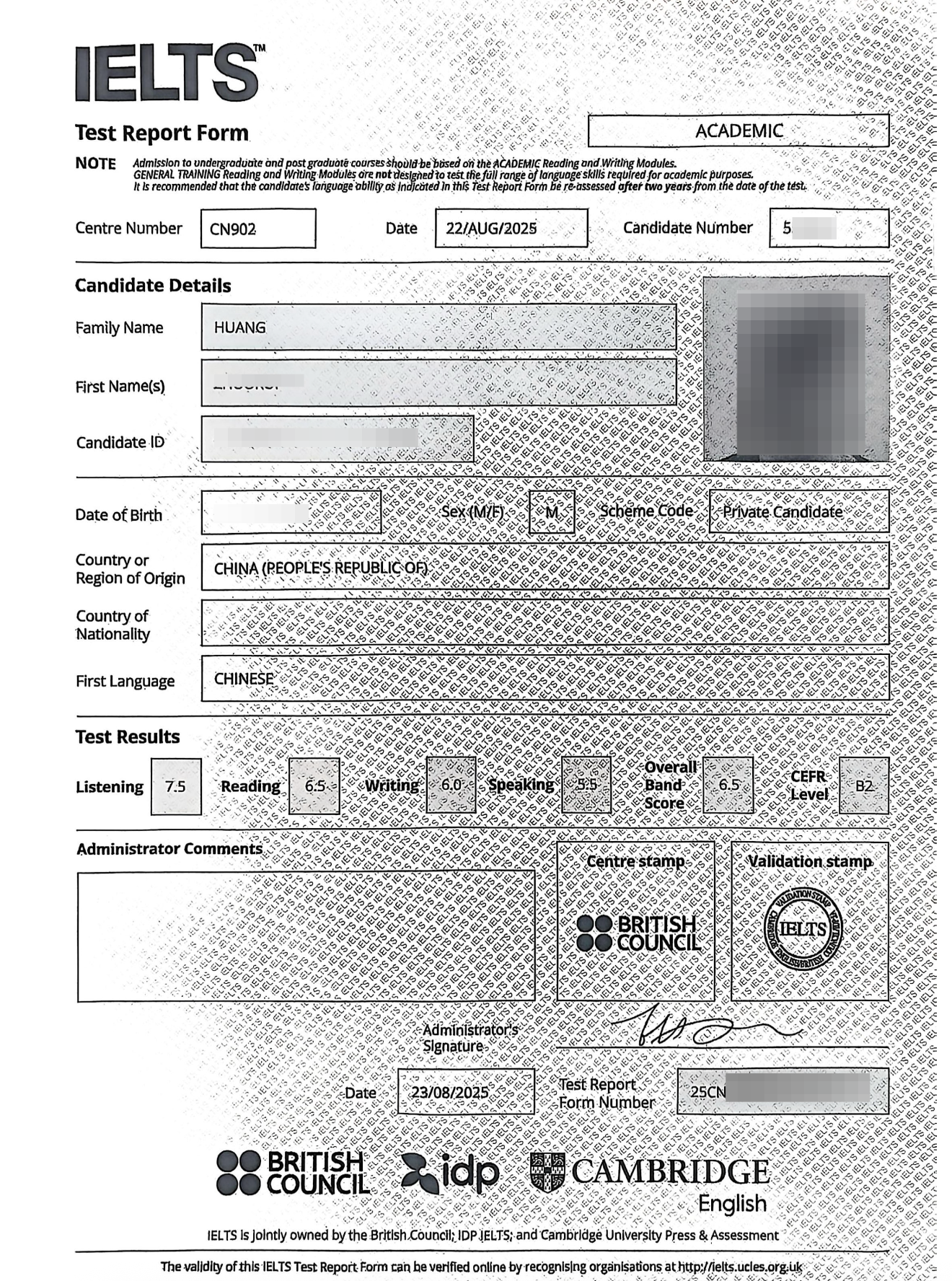 经过两个月的课程学习和全力备考,黄同学在8月底首考即获得雅思6.5的成绩,满足申请方案中所有项目的语言要求!