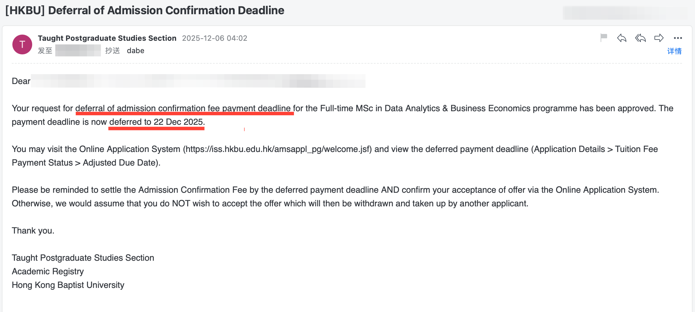 为了学生避免缴纳留位费后再收到港理工offer,我们找到合理的理由要求浸会延期留位费截止日期并成功获批。